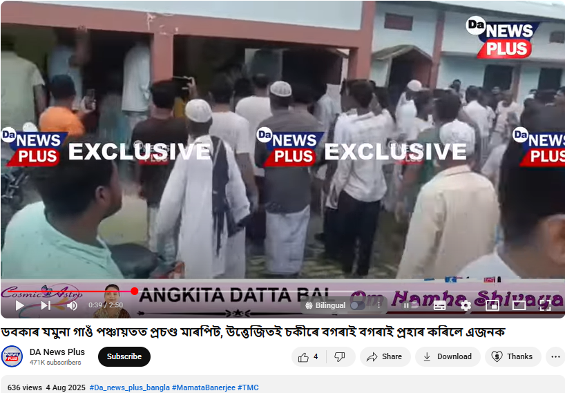 اس کے علاوہ ہمیں آسامی نیوز چینل ڈی اے نیوز پلس کے یوٹیوب چینل پر بھی اسی وائرل ویڈیو سے متعلق ایک ویڈیو رپورٹ ملی۔ یہاں بھی اس ویڈیو کو آسام کے ڈوبوکا کے جمونا گرام پنچایت کا بتایا گیا ہے۔