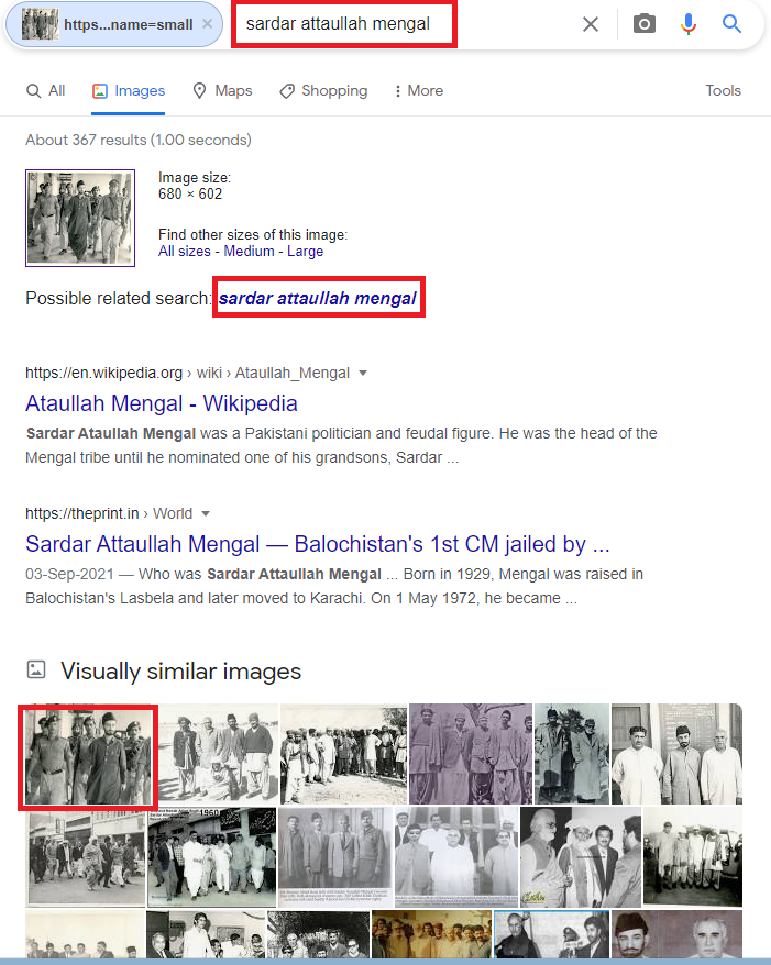 سید گیلانی کی جوانی کی تصویر کی سچائی جاننے کے لئے ہم نے اپنی ابتدائی تحقیقات شروع کی۔ سب سے پہلے ہم نے وائرل تصویر کو گوگل ریورس امیج سرچ کیا۔ جہاں ہمیں گوگل کروم کے اسکرین پر “سردار عطاء اللہ مینگل” لکھا ہوا نظر آیا اور وائرل تصویر کے ساتھ کئی لنک فراہم ہوئے۔ جسے آپ درج ذیل میں دیکھ سکتے ہیں۔
