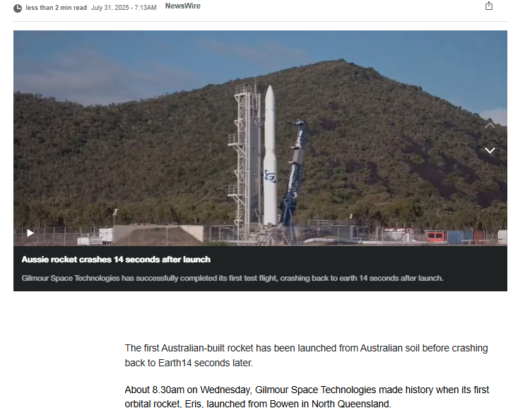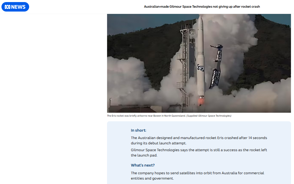مزید سرچ کے دوران ہمیں 31 جولائی 2025 کو شائع نیوز ڈاٹ کام ڈاٹ اے یو کی ایک رپورٹ ملی۔ رپورٹ کے مطابق “بدھ کی صبح تقریباً 8.30 بجے، گلمور اسپیس ٹیکنالوجیز نے اس وقت تاریخ رقم کی جب اس کا پہلا آربیٹل راکٹ، ایرس، نارتھ کوئنز لینڈ کے بوون سے لانچ ہوا”۔ ساتھ ہی رپورٹ میں یہ بھی بتایا گیا ہے کہ زمین بوس ہونے سے پہلے 14 سیکنڈ راکٹ نے ہوا میں پرواز کی۔
