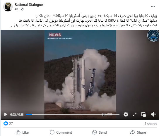 سوشل میڈیا پر 23 سیکنڈ کی ایک ویڈیو شیئر کی جا رہی ہے، جس میں مبینہ طور پر آسٹریلیائی راکٹ کو تباہ ہوتے ہوئے دکھایا جا رہا ہے۔ دعویٰ کیا جا رہا ہے کہ اس راکٹ میں خلائی تحقیق کے بھارتی ادارے اسرو کے بنائے ہوئے انجن کا استعمال کیا گیا ہے اور یہ راکٹ لانچ ہونے کے 14 سیکنڈ بعد ہی زمین بوس ہو گیا۔