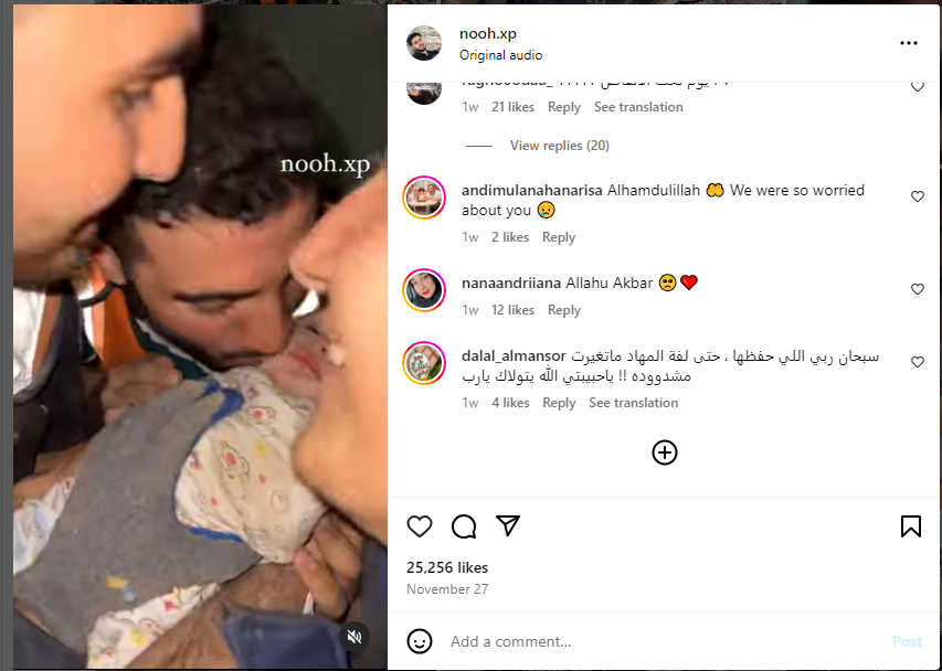 کیپشن کا ترجمہ کرنے پر معلوم ہوا کہ یہ بچی فلسطین-اسرائیل کے حالیہ تنازع کے بعد پیدا ہوئی تھی اور اس کے والدین اسرائیلی حملے میں شہید ہو چکے تھے، جبکہ اسے 3 گھنٹے کی مشقت کے بعد ملبے سے زندہ نکال لیا گیا تھا۔
