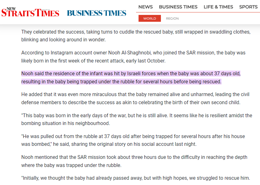 مزید سرچ کے دوران ہمیں اس حوالے سے شائع متعدد رپورٹس موصول ہوئیں، ان سبھی رپورٹس کے مطابق بچی کو 3 گھنٹے بعد ہی ملبے سے زندہ نکال لیا گیا تھا۔ نیو اسٹریٹس ٹائمس کی رپورٹ کے مطابق نوح نے بتایا کہ بچی کی عمر محض 37 دن تھی، جب اس کا گھر اسرائیلی حملے کا شکار ہو گیا تھا اور وہ ملبے میں پھنس گئی تھی۔