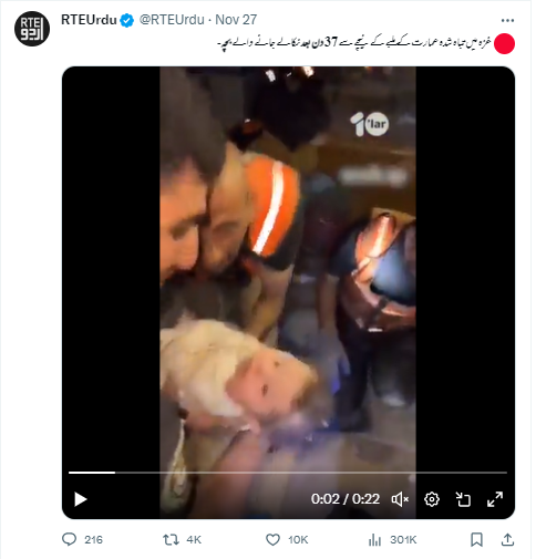 ان دنوں سوشل میڈیا پر ایک نومولود بچی کی ویڈیو خوب شیئر کی جا رہی ہے، جسے تباہ شدہ عمارت سے نکالا جا رہا ہے۔ ویڈیو کے ساتھ کیپشن میں صارفین لکھ رہے ہیں کہ “غزہ میں ملبے سے 37 دن بعد زندہ نکالی گئی بچی کی ویڈیو”۔ اس ویڈیو کو فیس بک، ایکس سمیت تمام سوشل میڈیا ایپس پر شیئر کیا جا رہا ہے۔