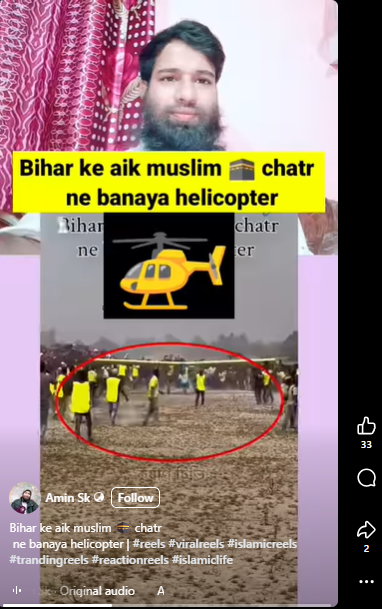 سوشل نٹورکنگ سائٹس فیس بک اور انسٹاگرام پر ایک ویڈیو شیئر کی جا رہی ہے جس میں دعویٰ کیا جا رہا ہے کہ بہار کے ایک مسلم لڑکے نے ایک ہوائی جہاز بنایا ہے۔ ویڈیو میں خود ساختہ طیارے کو زمین پر دوڑتے اور پھر فضاء میں ٹیک آف کرتے ہوئے دیکھا جا سکتا ہے۔ اس میں ایک نوجوان بیٹھا ہوا نظر آرہا ہے اور جہاز کے پچھلے حصے میں ایک گھومتا ہوا پنکھا بھی نصب ہے جب کہ اردگرد لوگوں کا ہجوم نظر آرہا ہے۔