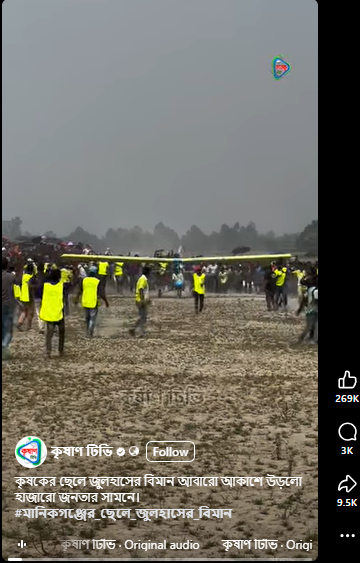 وائرل ویڈیو کے چند فریموں کو سب سے پہلے ہم نے گوگل لینس پر تلاش کیا۔ اس دوران ہمیں یہی ویڈیو 9 مارچ 2025 کو ‘کرشن ٹی وی‘ نامی فیس بک پیج پر شیئر شدہ موصول ہوئی۔ ویڈیو میں بنگلہ کیپشن کے ساتھ لکھا گیا کہ یہ کلپ بنگلہ دیش کے مانک گنج کی ہے اور یہ طیارہ کسان کے بیٹے جولھاس نے بنایا ہے۔