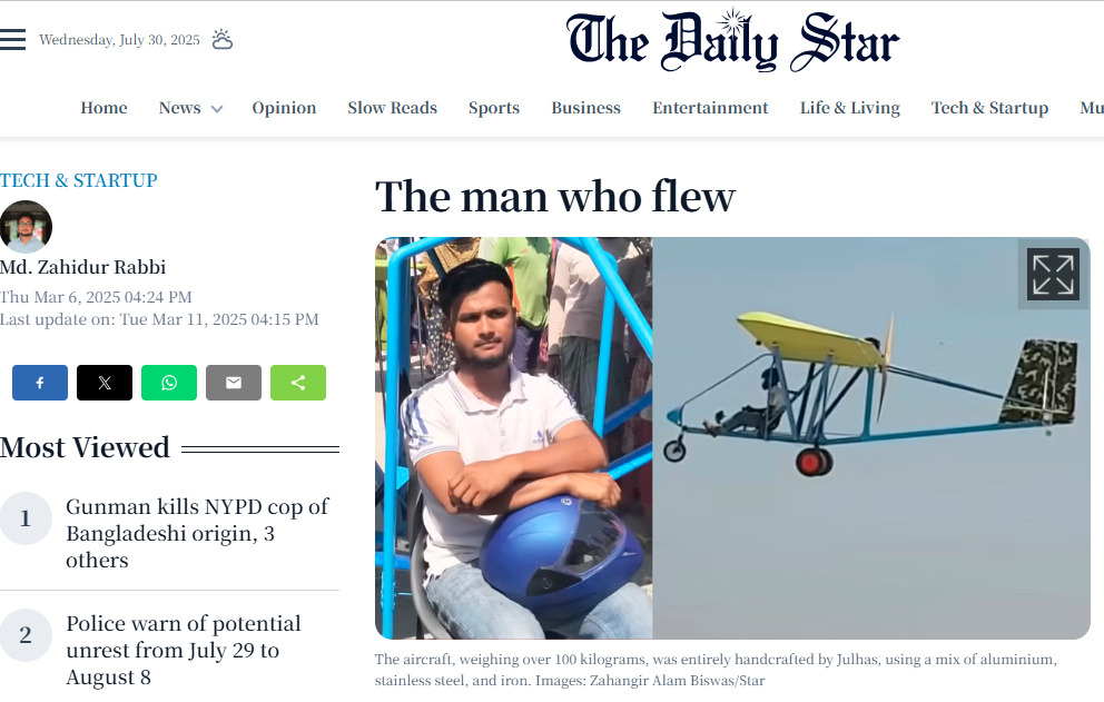 دی ڈیلی اسٹار کی ویب سائٹ پر 6 مارچ کو شائع ایک رپورٹ میں بتایا گیا ہے کہ 4 مارچ 2025 کو یمنا ندی کے کنارے جعفر گنج میں ایک انوکھا نظارہ دیکھا گیا، جب جولہاس مولا نے اپنے ہاتھوں سے بنائے گئے الٹرا لائٹ طیارے کو کامیابی کے ساتھ اڑایا۔ اس پرواز کو دیکھنے کے لئے لوگوں کی ایک بڑی تعداد وہاں موجود تھی۔