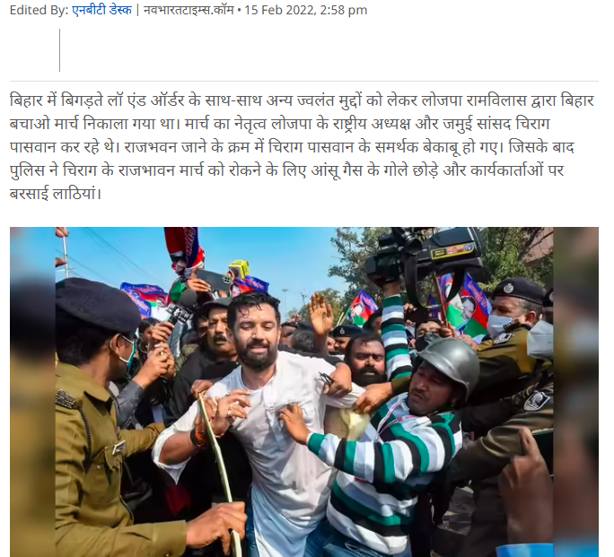 مزید تحقیقات کے دوران نوبھارت ٹائمز کی 15 فروری 2022 کی رپورٹ ملی، جس کے مطابق یہ ویڈیو بہار کے پٹنہ میں لوک جن شکتی پارٹی کی جانب سے نکالے گئے احتجاجی مارچ ”بہار بچاؤ مارچ” کی ہے۔ چراغ پاسوان نے اس مارچ کی قیادت بہار میں بگڑتی ہوئی قانون و انتظامیہ کی صورتحال اور نتیش حکومت کے خلاف کی تھی۔ مارچ کے دوران حالات کشیدہ ہونے پر پولس نے ہڑتالی موڑ کے قریب کئی مظاہرین کے ساتھ چراغ پاسوان کو بھی حراست میں لیا تھا۔