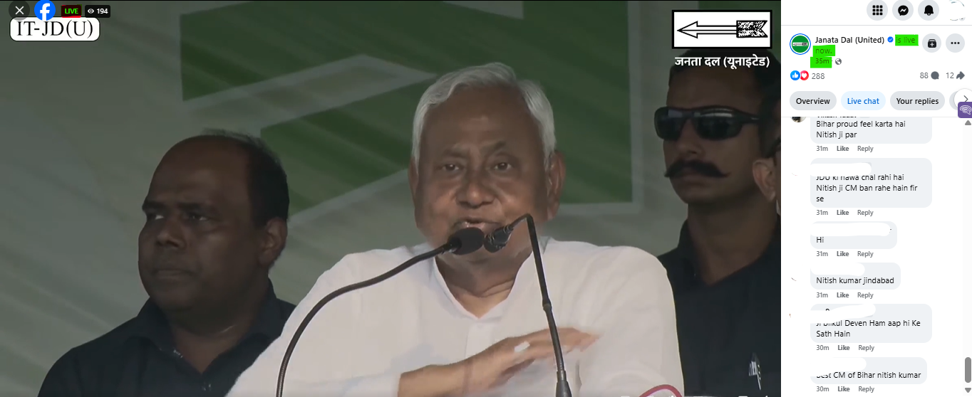 ابتدائی تحقیق کے دوران نیوز چیکر نے بہار کے سرکاری اور میڈیا ذرائع کا جائزہ لیا۔ ہمیں جنتا دل (یونائیٹڈ) کے آفیشل فیس بک پیج پر 5 نومبر 2025 کو پوسٹ کی گئی ایک لائیو ویڈیو ملی، جس میں بہار کے وزیر اعلیٰ نتیش کمار پورنیہ کے بھوانی پور میں عوامی جلسے سے خطاب کرتے ہوئے واضح طور پر نظر آ رہے ہیں۔ اس سے ثابت ہوتا ہے کہ ان کے انتقال کی خبر مکمل طور پر جھوٹی ہے۔
