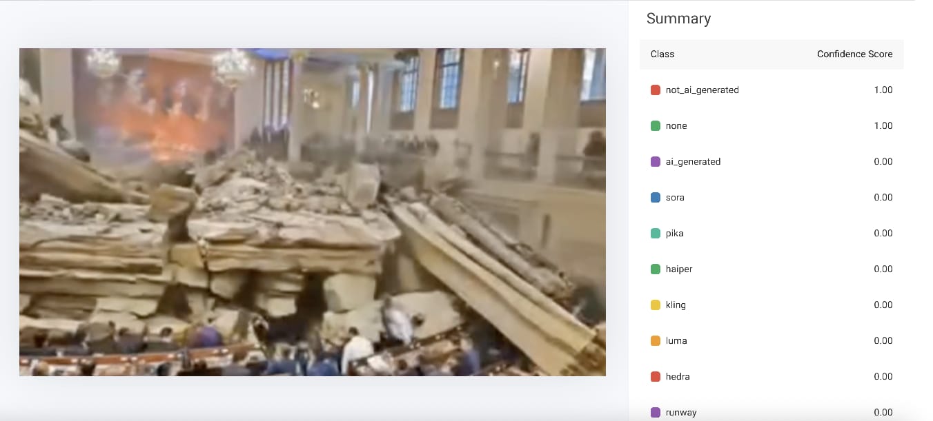 کولمبیائی پارلیمنٹ عمارت کے زمین بوس ہونے کا بتاکر شیئر کی ویڈیو کا ہم نے بغور تجزیہ کیا تو شبہ ہوا کہ یہ ویڈیو اے آئی سے تیارکردہ ہو سکتی ہے کیونکہ اس میں نظر آ رہے افراد ایک دوسرے میں ضم ہوتے ہوئے نظر آ رہے ہیں اور لوگ آنکھوں کے سامنے اتنی بڑی عمارت کو گرتا ہوا دیکھ رہے ہیں مگر کوئی بھی بھاگنے کی کوشش کرتا ہوا دکھائی نہیں دے رہا ہے۔