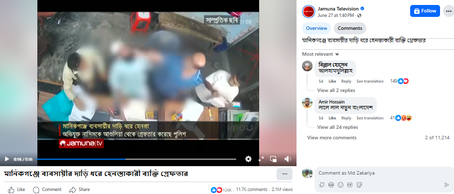 بھارت میں مسلم شخص کی پٹائی کا بتاکر شیئر کی گئی ویڈیو کی حقیقت جاننے کے لئے ہم نے سب سے پہلے ویڈیو کو ریورس امیج سرچ کیا۔ اس دوران ہمیں جمونا ٹیلیویژن کے فیس بک پیج پر اس حوالے سے 27 جون 2025 کو اپلوڈ شدہ ایک ویڈیو رپورٹ موصول ہوئی۔ اوراس کے ساتھ بنگلہ زبان میں کیپشن موجود تھا، جس کا ترجمہ تھا “مانک گنج میں داڑھی والے تاجر کو ہراساں کرنے والا شخص گرفتار”۔