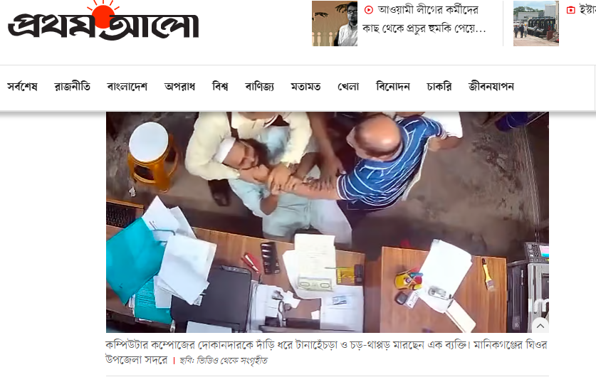 مزید سرچ میں ہمیں بنگلہ دیشی نیوز ویب سائٹ پرتھم آلو پر 24 جون 2025 کو شائع ایک رپورٹ موصول ہوئی۔ اس رپورٹ میں وائرل ویڈیو کی تصویر موجود تھی۔ اس رپورٹ کے مطابق مانک گنج کے گھیور ضلع میں یہ واقعہ پیش آیا تھا، جہاں علی اعظم عرف مانک نامی تاجر پر نسیم بھویاں نامی شخص نے حملہ کیا تھا۔ علی اعظم مانک کمپیوٹر اینڈ ٹریننگ سینٹر نام سے ایک دکان چلاتا ہے۔ نسیم بھویاں مختلف کاموں کے لئے اکثر اس کی دکان پر آتا تھا اور پیسے کی ادائیگی نہیں کرتا تھا۔ ساتھ ہی اس کی پیسے مانگنے پر دکان بند کروانے کی دھمکی بھی دیتا تھا۔