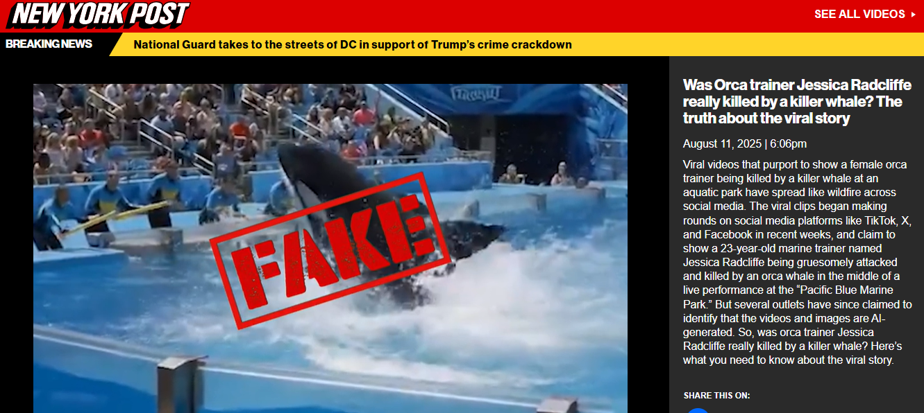 ہم نے سب سے پہلے گوگل پر انگلش میں “ڈولفن کلڈ ٹرینر جیسیکا” کیورڈ سرچ کیا۔ اس دوران وائرل ویڈیو سے متعلق 11 اگست 2025 کو شائع ہونے والی نیو یارک پوسٹ کی ایک ویڈیو رپورٹ موصول ہوئی۔ جس میں ویڈیو کے ساتھ کئے دعوے کو فرضی اور ویڈیو کو اے آئی سے تیار کردہ بتایا گیا ہے۔