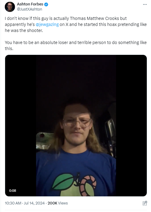 ویڈیو کے ساتھ موجود کیپشن میں ایکس ہینڈل جیوگیزنگ کا ذکر کرتے ہوئے لکھا ہے “مجھے نہیں پتا ہے کہ یہ لڑکا تھامس میتھیو کروکس ہے یا نہیں، لیکن بظاہر یہ جیوگیزنگ ہے اور اس نے یہ دکھاوا کرنے کی کوشش کی ہے کہ جیسے وہی شوٹر ہو”۔