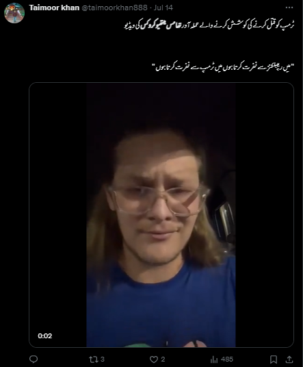 ویڈیو کے ساتھ ایک صارف نے کیپشن میں لکھا ہے “ٹرمپ کو قتل کرنے کی کوشش کرنے والے حملہ آور تھامس میتھیو کروکس کی ویڈیو، میں ریپبلکنز سے نفرت کرتا ہوں میں ٹرمپ سے نفرت کرتا ہوں “۔