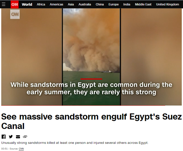سمندری طوفان کی وائرل ویڈیو کو سب سے پہلے ہم نے کیفریم میں تقسیم کیا اور کچھ کیفریم کو ریورس امیج سرچ کیا۔ اس دوران ہمیں سی این این پر اس حوالے سے ایک ویڈیو رپورٹ ملی۔ اس رپورٹ میں بتایا گیا ہے مصر کے قاہرہ اور سوئز کنال پر ریتیلا طوفان آیا تھا۔ جس کی وجہ سے سڑکوں پر بھی ریت کی دھند تھی اور اس طوفان نے سوئز کنال کو بھی اپنی لپیٹ میں لیا تھا۔
