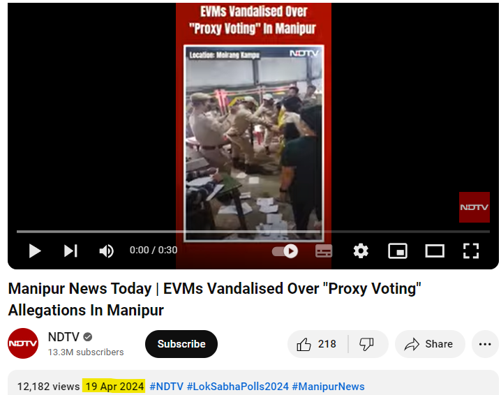 وائرل ویڈیو کے ایک فریم کو ریورس امیج سرچ کیا تو ہمیں ہوبہو ویڈیو این ڈی ٹی وی کے آفیشل یوٹیوب چینل پر موصول ہوئی۔ جسے 19 اپریل 2024 کو اپلوڈ کیا گیا تھا۔ جس کے عنوان میں لکھا تھا کہ “منی پور میں “پراکسی ووٹنگ” کے الزام میں ای وی ایم کو تباہ کیا گیا”۔ بتادوں کہ “پراکسی ووٹنگ” غیر قانونی طور پر کسی شخص کی جگہ کسی اور شخص کو ووٹ ڈالنے کا اختیار دینے کا عمل ہے۔