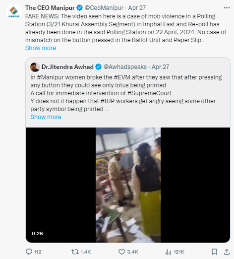 الیکشن کمیشن نے بھی اس دعوے کو جعلی قرار دیتے ہوئے مسترد کر دیا۔ ایکس ہینڈل پر سی ای او منی پور نے وائرل پوسٹ کو شیئر کرتے ہوئے لکھا ہے کہ “یہاں نظر آنے والا ویڈیو امپھال ایسٹ میں ایک پولنگ اسٹیشن(3/21 کُھرائی اسمبلی حلقہ) پر ہوئے ہجومی تشدد کی ہے اور 22 اپریل 2024 کو یہاں دوبارہ پولنگ ہو چکی ہے۔ بیلٹ یونٹ میں دبائے گئے بٹن اور وی وی پیٹ کے ذریعےنکلی پرچی کے بیچ عدم مماثلت کا کوئی معاملہ سامنے نہیں آیا ہے نا ہی ایسی کوئی شکایت کسی کی جانب سے کی گئی ہے۔ فرضی خبریں پھیلانے پر قانونی کاروائی کی جا رہی ہے”۔