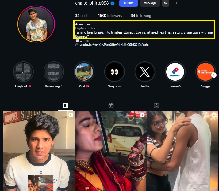 مزید تحقیق کے دوران ہم نے کنٹنٹ کریئٹر کے انسٹاگرام پیج اور یوٹیوب چینل کا جائزہ لیا، جہاں متعدد ایسی ویڈیوز موجود پائی گئیں جو واضح طور پر اسکرپٹ شدہ معلوم ہوتی ہیں اور جن میں محبت، دھوکہ دہی اور جذباتی رشتوں کے موضوعات کو ڈرامائی انداز میں پیش کیا گیا ہے۔ آرو ماوی نے اپنے یوٹیوب چینل اور انسٹاگرام کی تفصیل میں لکھا ہے ”دل ٹوٹنے کے درد کو لافانی کہانیوں میں بدلنا”۔ ساتھ ہی انہوں نے صارفین سے اپنی ذاتی کہانیاں شیئر کرنے کی درخواست بھی کی ہے۔