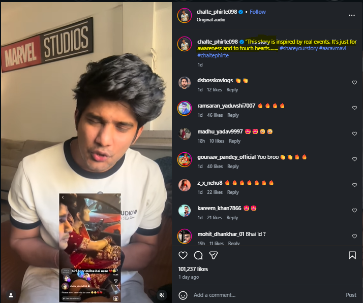 وائرل دعوے کی حقیقت جاننے کے لئے نیوز چیکر اردو نے ویڈیو کے مختلف فریمز کو ریورس امیج سرچ کیا۔ اس دوران معلوم ہوا کہ یہی ویڈیو 13 دسمبر 2025 کو ‘آرو ماوی’ نامی ایک بھارتی کنٹنٹ کریئٹر کے یوٹیوب چینل اور انسٹاگرام پیج پر پہلے ہی اپلوڈ کی جا چکی ہے۔ تاہم ابتدائی پوسٹس میں یہ واضح نہیں کیا گیا ہے کہ ویڈیو حقیقی واقعے پر مبنی ہے یا اسکرپٹڈ۔