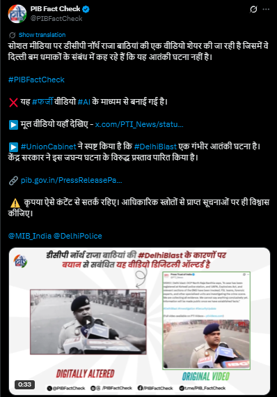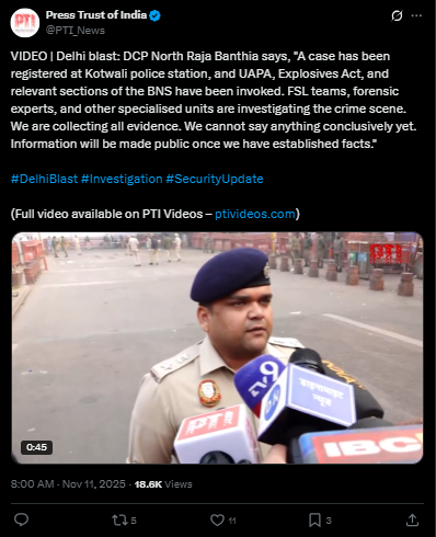 اصل ویڈیو میں ڈی سی پی شمال راجا بنتھیا واضح طور پر بتا رہے ہیں کہ دہلی پولس اسٹیشن میں ایک کیس درج کر لیا گیا ہے، جس میں یو اے پی اے، ایکسپلوزِوز ایکٹ اور بی این ایس کی متعلقہ دفعات شامل ہیں۔ انہوں نے کہا کہ ایف ایس ایل ٹیمیں اور فورنسک ماہرین جائے وقوعہ کا جائزہ لے رہے ہیں اور ڈی سی پی نے مزید بتایا کہ حقائق واضح ہونے کے بعد ہی معلومات عوام کے ساتھ شیئر کی جائیں گی۔