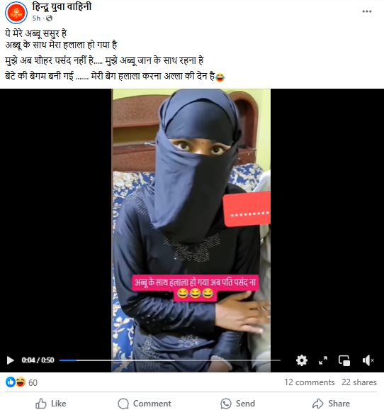 سوشل نٹورکنگ سائٹس فیس بک اور ایکس پر ایک ویڈیو شیئر کی جا رہی ہے۔ جس میں برقعہ پوش خاتون ایک عمر رسید شخص کو اپنا خسر بتا رہی ہے اور یہ بھی کہتی ہوئی سنائی دے رہی ہے کہ ان کا اپنے خسر کے ساتھ مبینہ طور پر حلالہ ہوا ہے، ویڈیو میں بوڑھا شخص یہ کہتے ہوئے سنائی دے رہا ہے خاتون پہلے بہو تھی اب اس سے حلالہ ہوا ہے۔ اسی تناظر میں صارفین ویڈیو کو مذہبی رنگ دے کر شیئر کر رہے ہیں۔