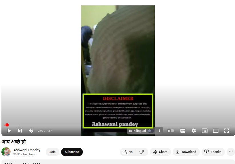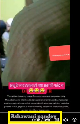 ہم نے خسر کے ساتھ بہو کے حلالہ کا بتاکر شیئر کی گئی وائرل ویڈیو کا بغور تجزیہ کیا۔ اس دوران ہمیں وائرل ویڈیو کے 6 سکینڈ پر ایک ڈسکلیمر نظر آیا، جس کے نیچے موٹے لفظوں میں انگلش میں اشونی پانڈے لکھا ہوا تھا۔ یہاں سے معلوم ہوا اس ویڈیو کو کسی اشونی پانڈے نے فلمایا ہے۔