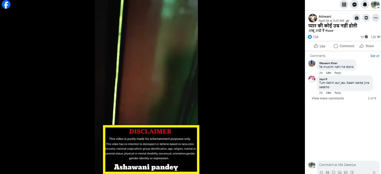 پھر ہم نے گوگل پر “اشونی پانڈے۔ حلالہ، اسکرپٹیڈ ویڈیو” کیورڈ سرچ کیا۔ اس دوران ہمیں 28 اپریل 2025 کو اشونی نامی فیس بک پیج پر وائرل ویڈیو سے ملتا جلتا ایک پوسٹ موصول ہوا۔ جس میں اسی بوڑھے شخص کو برقعہ پوش خاتون کے ساتھ دیکھا جا سکتا ہے۔ البتہ اس ویڈیو میں خاتون اپنے چہرے کو ڈھانکے ہوئی نہیں ہے۔ اس ویڈیو کے 7 سکینڈ پر ایک ڈسکلیمرمیں لکھا ہے کہ اسے تفریحی مقاصد کے لئے فلمایا گیا ہے۔