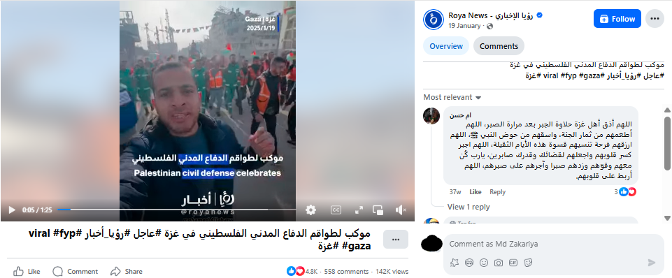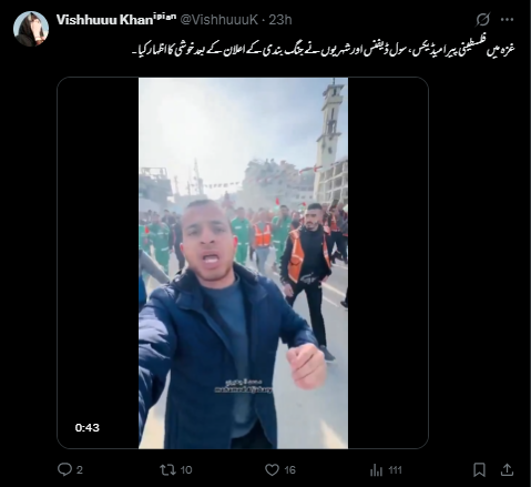 فیس بک اور ایکس صارف نے ویڈیو کے ساتھ لکھا ہے “غزہ میں فلسطینی پیرا میڈیکس، سول ڈیفنس اور شہریوں نے جنگ بندی کے اعلان کے بعد خوشی کا اظہار کیا”۔