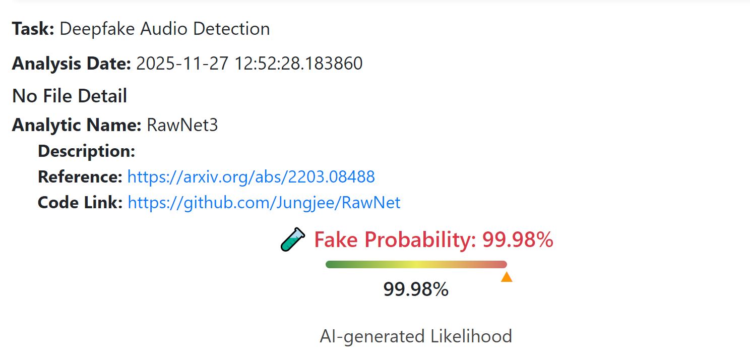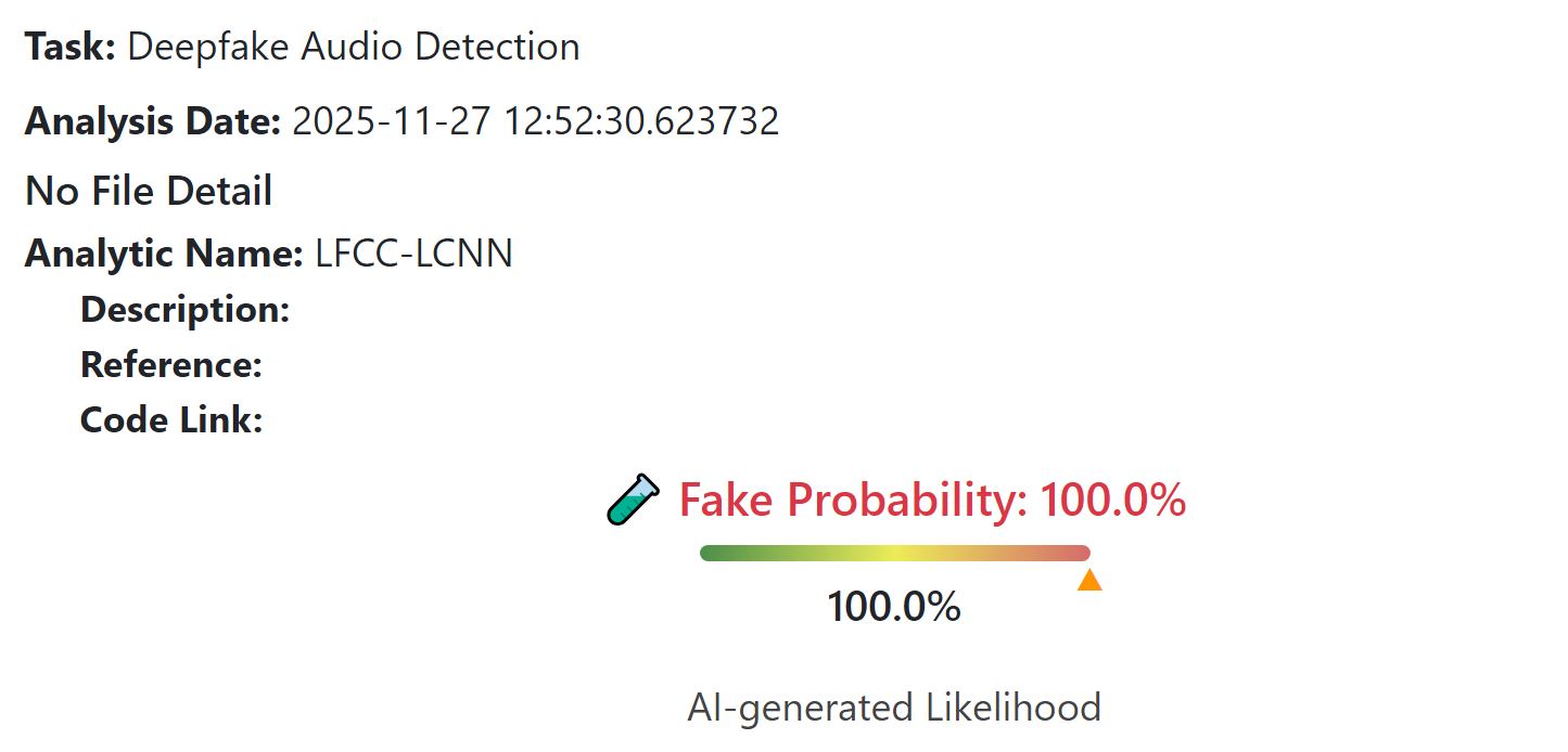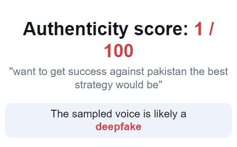 آڈیو کی نوعیت جانچنے کے لیے نیوز چیکر نے دو معتبر اے آئی ڈی ٹیکٹر ٹولز کی مدد لی۔ ہی یا ڈیپ فیک وائس ڈیٹیکٹر نے ویڈیو میں استعمال شدہ آواز کو محض 1 از 100 کا درجہ دیا، جو واضح کرتا ہے کہ آواز میں بڑی حد تک مصنوعی ہیرا پھیری کی گئی ہے۔ اسی طرح یو بی میڈیا فورینزک لیب کے تیار کردہ ڈیپ فیک او میٹر نے بھی آڈیو کو جعلی قرار دیتے ہوئے اسے 99.98 فیصد اور 100 فیصد امکان کے ساتھ مصنوعی ثابت کیا۔