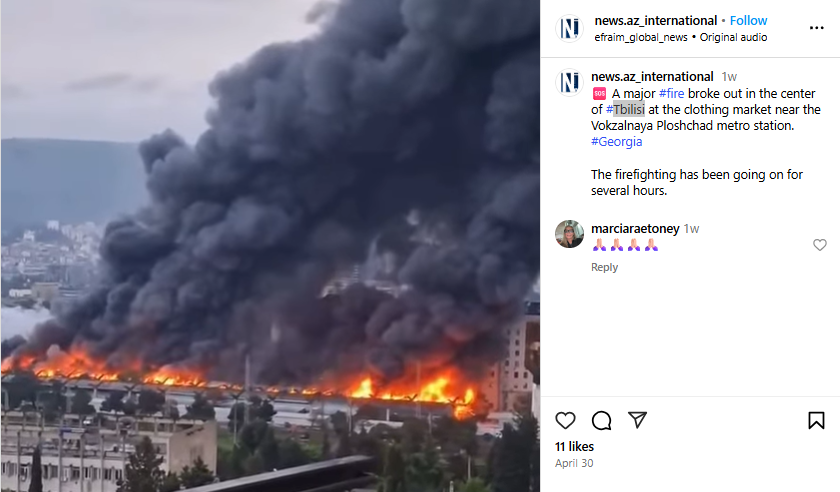 ہم نے وائرل ویڈیو کے ایک فریم کو گوگل لینس پر سرچ کیا۔ اس دوران ہمیں 30 اپریل کو نیوز ڈاٹ اے زیڈ انٹرنیشنل نامی انسٹاگرام پر شیئر شدہ یہی ویڈیو موصول ہوئی۔ جس کے مطابق آگزنی کا یہ واقعہ جورجیا کے تبلیسی میں موجود کپڑے کے مارکیٹ میں پیش آیا تھا۔
