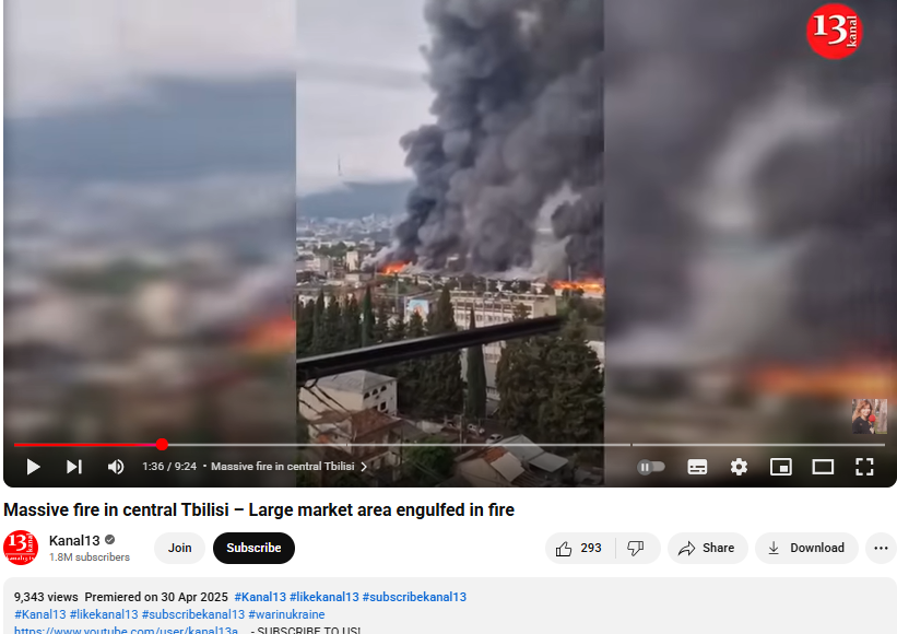 مزید تحقیقات کے دوران ہمیں یہی ویڈیو آذربائیجان کے پروفیشنل انٹرنیٹ ٹی وی کے آفیشل یوٹیوب چینل کنال13 پر 30 اپریل 2025 کو اپلوڈ شدہ موصول ہوئی۔ جس کے ساتھ فراہم کردہ معلومات کے مطابق جارجیا کی دارالحکومت تبلیسی کے ایک ریلوے بازار میں زبردست آگزنی کا واقعہ پیش آیا تھا، اس حادثے میں کسی بھی طرح کے جانی نقصان کی اطلاع نہیں ہے۔ حالانکہ فائر فائٹر کی مدد سے آگ پر قابو پانے کی کوشش کی گئی تھی۔ اس حوالے سے دیگر میڈیا رپورٹس یہاں اور یہاں پڑھ سکتے ہیں۔