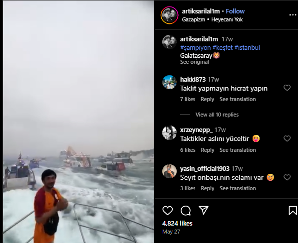 مزید سرچ کے بعد ہمیں پتہ چلا کہ ترکی کے مشہور فٹبال کلب گلاتسرے نے مئی 2025 میں لیگ جیتنے کے بعد استنبول سمیت ملک بھر میں جشن منایا تھا۔ ان کے مداحوں نے زمین کے ساتھ ساتھ سمندر میں کشتیوں پر بھی جشن منایا، اور آتش بازی کی تھی۔