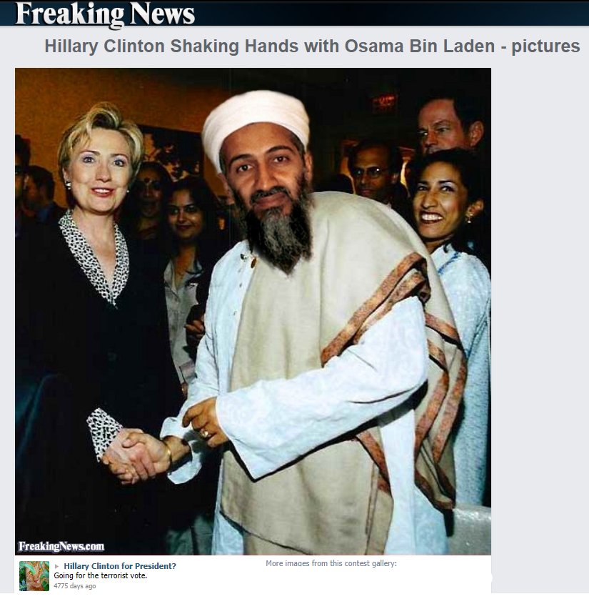 اس طرح نیوز چیکر کی تحقیقات سے یہ ثابت ہوا کہ ہیلری کلنٹن کی اسامہ بن لادن سے ہاتھ ملاتے ہوئے یہ تصویر فوٹو شاپ کی مدد سے تیار کی گئی، دراصل یہ تصویر بھارتی موسیقار شبھاشش مکھرجی کی ہیلری کلنٹن سے ملاقات کی ہے۔