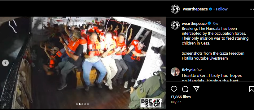 ویئر دی پیس نامی انسٹاگرام پر اپلوڈ کی گئی ایک پوسٹ میں وائرل ویڈیو کے حوالے سے بتایا گیا کہ یہ کاروائی جولائی 2025 میں پیش آئی، جب اسرائیلی فورسز نے “حنظلہ” نامی امدادی جہاز پر بین الاقوامی پانیوں میں چھاپہ مارا تھا۔ پوسٹ کے مطابق یہ جہاز فریڈم فلوٹیلا کا حصہ تھا، جو کئی ممالک کے کارکنان کے ساتھ غزہ کی عوا، تک امداد پہنچانے کی کوشش کر رہا تھا۔ اس پوسٹ میں بھی پاکستانی سینیٹر مشتاق احمد خان کی موجودگی کا ذکر نہیں ہے۔