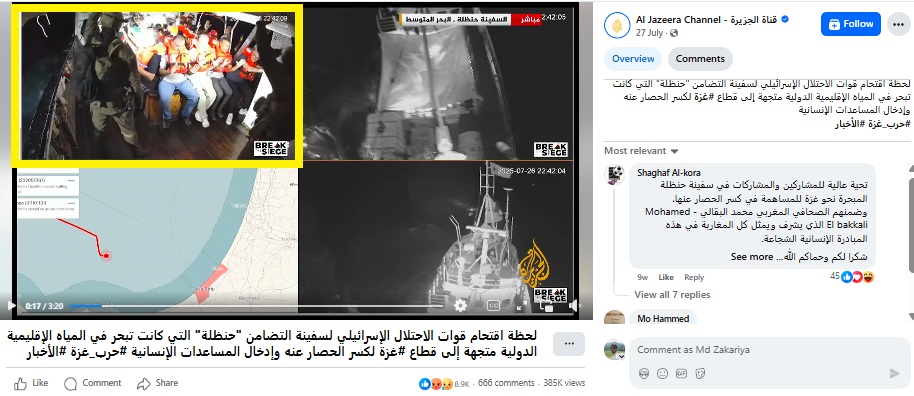 ہم نے وائرل ویڈیو کے چند فریموں کو سب سے پہلے گوگل لینس کی مدد سے تلاش کیا۔ اس دوران ہمیں الجزیرہ قناہ نامی فیس بک پیج پر یہی ویڈیوعربی کیپشن کے ساتھ 27 جولائی 2025 کو شیئر شدہ ملی۔ ترجمہ کرنے پر معلوم ہوا یہ ویڈیو غزہ کی جانب انسانی امداد لے کر جا رہے حنظلہ جہاز پر اسرائیلی افواج کے دھاوا بولنے کی ہے۔