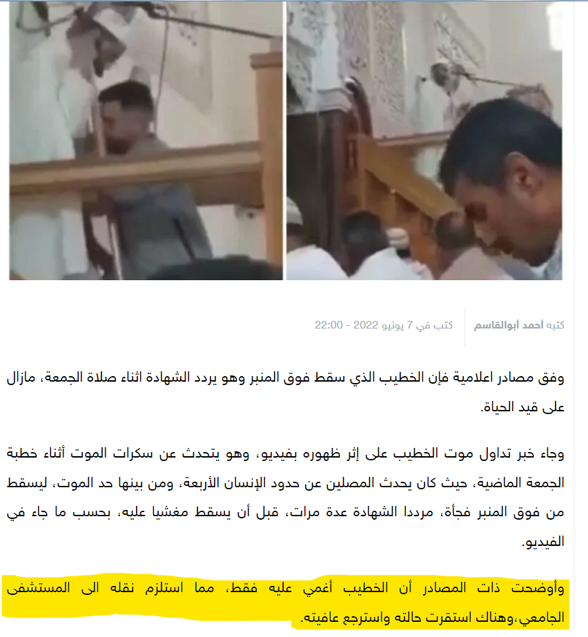 نیوز چیکر کی تحقیقات سے یہ ثابت ہوا کہ خطبہ دیتے ہوئے مراکش کے امام کی موت نہیں ہوئی تھی، بلکہ وہ بے ہوش ہوئے تھے بعد میں انہوں نے مسجد میں خطبہ بھی دیا تھا۔