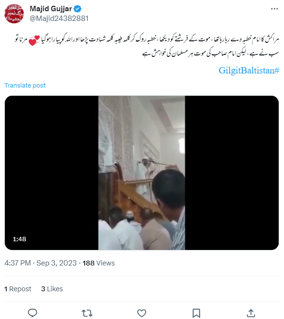 ایک فیس بک صارف نے ویڈیو کے کیپشن میں لکھا ہے کہ “مراکش کا امام خطبہ دے رہا رہا تھا، موت کے فرشتے کو دیکھا، خطبہ روک کر کلمہ طیبہ، کلمہ شہادت پڑھا اور اللہ کو پیارا ہو گیا۔ مرنا تو سب نے ہے، لیکن امام صاحب کی موت ہر مسلمان کی خواہش ہے”۔