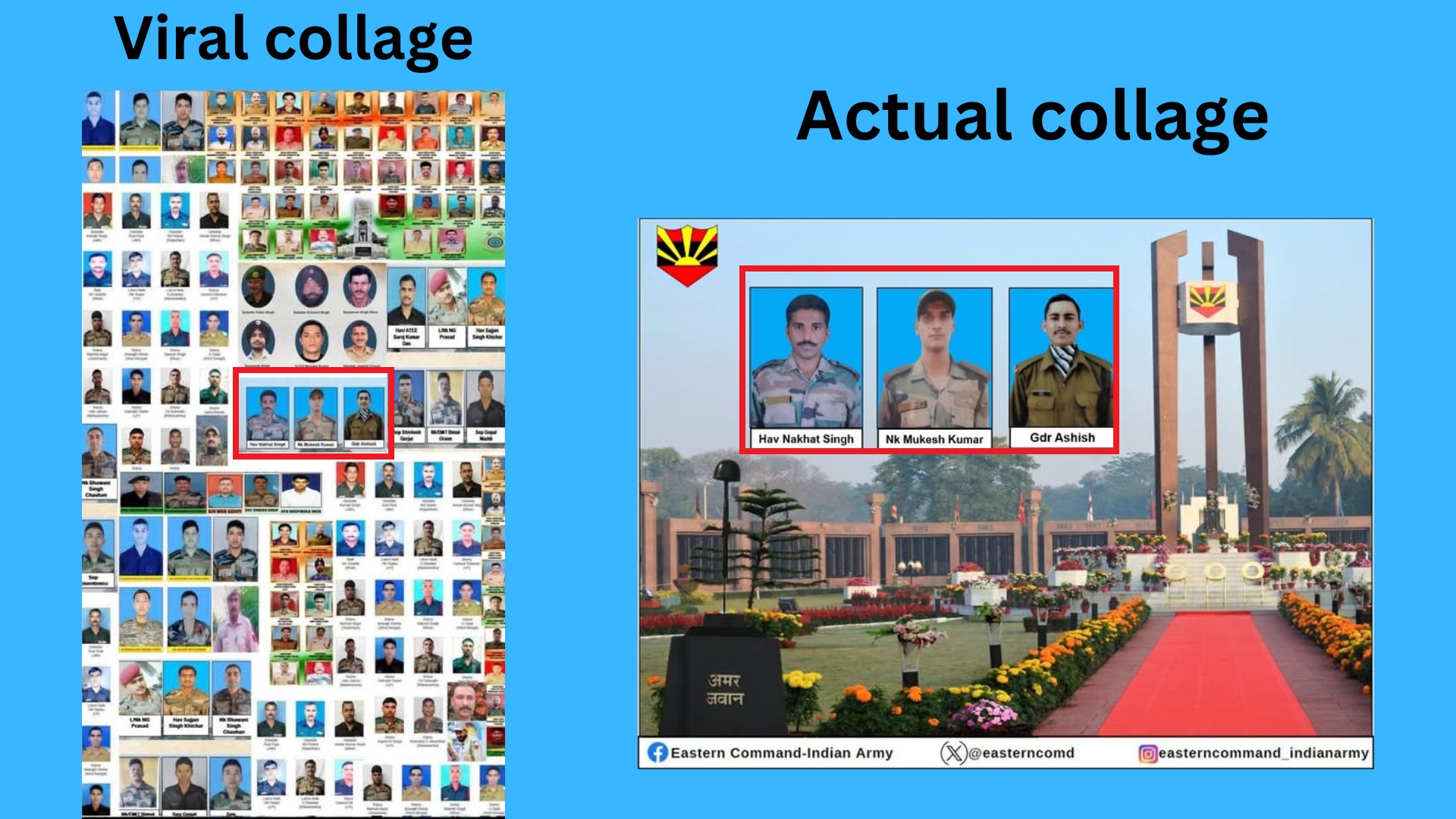 جواب: جی ہاں۔ کولاج میں تین فوجی جوانوں کی تصاویر وہی ہیں جو 2023 میں اروناچل پردیش کے ایک فوجی حادثے کے بعد ایسٹرن کمانڈ انڈین آرمی کے آفیشل فیس بک پیج پر شیئر کی گئی تھیں۔