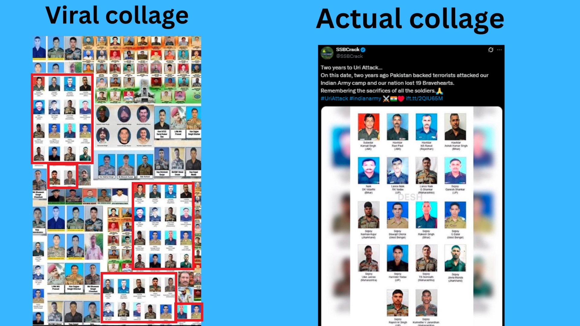 کولاج میں شامل کئی تصاویر کو ایس ایس بی کریک نامی ایکس ہینڈل پر 19 ستمبر 2018 کو شیئر کیا گیا ہے۔ جس میں ان جوانوں کو اوڑی حملے میں شہید ہوئے بھارتی جوانوں کا بتایا گیا ہے۔ ان جوانوں کی تصاویر وائرل کولاج میں 4 جگہ استعمال کی گئی ہے۔