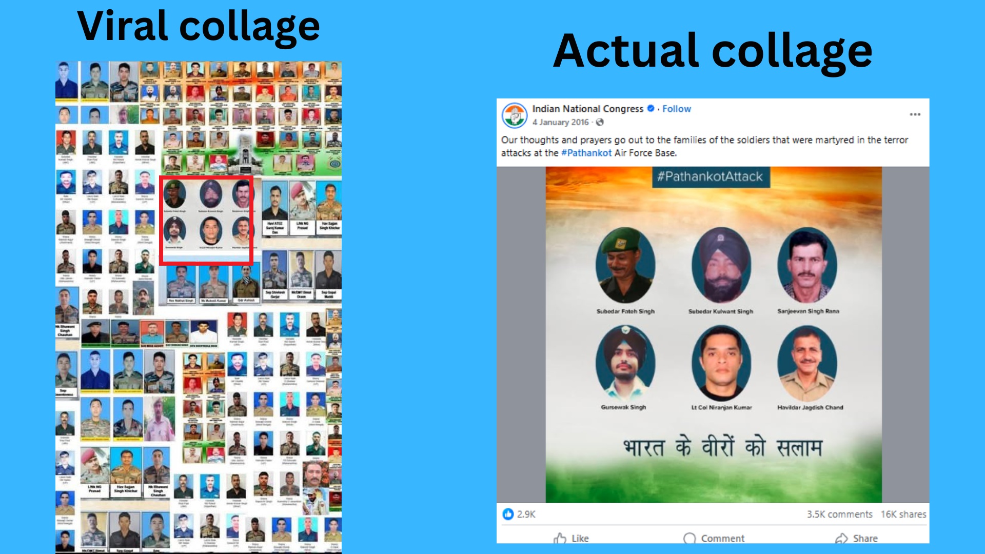 وہیں تلاش کے دوران ہمیں چھ اور شہید جوانوں کی تصاویر انڈین نیشنل کانگریس کے آفیشل فیس بک پیج پر موصول ہوئی۔ جس کے مطابق ان جوانوں کی شہادت پٹھان کوٹ ایئر فورس بیس پر دہشت گردانہ حملے میں ہوئی تھی۔