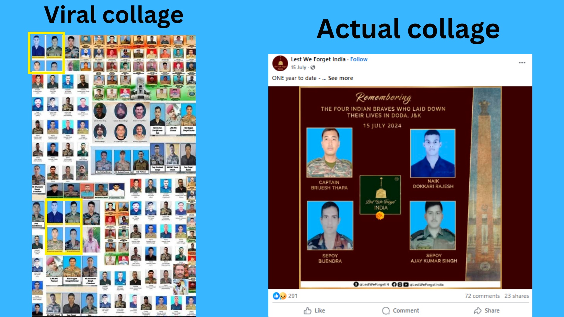15 جولائی 2025 کو لیسٹ وی فارگیٹ انڈیا نامی فیس بک پیج پر 4 دیگر جوانوں کی تصاویر موصول ہوئی۔ جس کے مطابق جموں کشمیر کے ڈوڈہ میں شہید ہوئے جوانوں کی یہ تصاویر ہیں۔ وائرل کولاج میں ان کی تصاویر کا 2 جگہ استعمال کیا گیا ہے۔