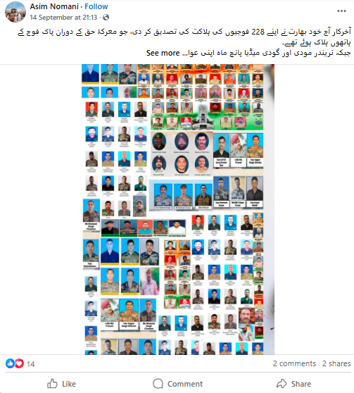 جواب: نہیں۔ بھارت کی جانب سے 228 فوجیوں کی شہادت کی کوئی تصدیق نہیں کی گئی ہے۔ یہ دعویٰ جھوٹا اور گمراہ کن ہے۔