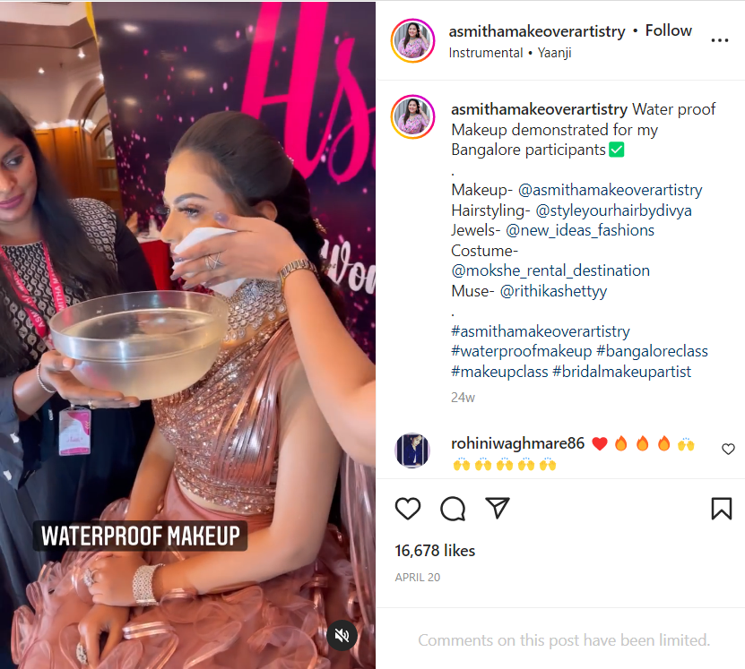 گوگل پر “اسمیتا میک اوور” کیورڈ سرچ کرنے پر ہمیں انسٹاگرام، فیس بک اور یوٹیوب کے کئی لنک ملے۔ ہم نے جب اسمیتا کے آفیشل انسٹاگرام کو کھنگالا تو ہمیں 20 اپریل 2022 کو شیئر کی گئی یہی ویڈیو ملی، جسے دلہن کی قدرتی خوبصورتی پرکھے جانے کا بتاکر شیئر کیا جارہا ہے۔ ویڈیو کے ساتھ دی گئی معلومات کے مطابق یہ ویڈیو بنگلور کے شرکاء کے لیے منعقد کیے گئے واٹر پروف میک اپ ورک شاپ کی ہے۔