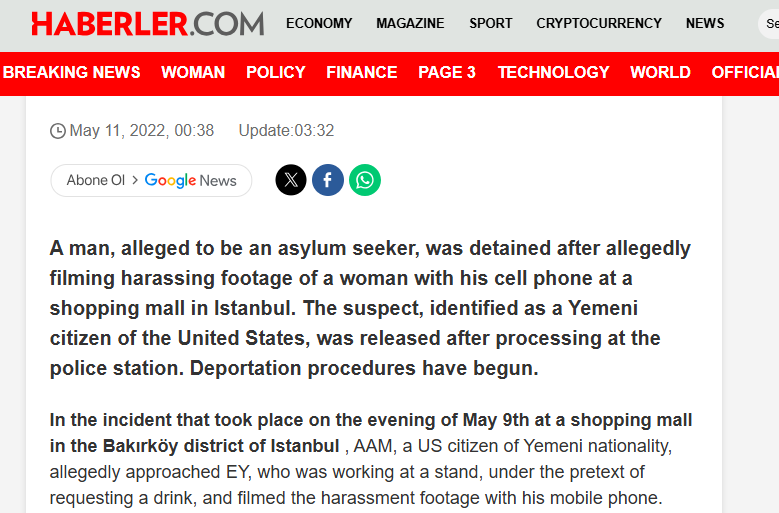 مزید تصدیق کے لئے ہم نے گوگل ین ڈیکس کے ساتھ مذکورہ کیورڈ سرچ کیا۔ اس دوران ہمیں اسی ویڈیو کے ساتھ ترکیہ نیوز ویب سائٹس پر 11 مئی 2022 کو ہلک ٹی وی اور ہیبرلر پر خبریں موصول ہوئیں۔ ترجمہ کرنے پر معلوم ہوا کہ ویڈیو میں جس شخص کی پیٹائی کی جا رہی ہے وہ یمنی نژاد امریکی شہری ہے، جس کا نام اے اے ایم ہے۔ جسے استنبول کے ایک شاپنگ مال میں خواتین کو ہراساں کرنے کے الزام میں پولس نے گرفتار کیا تھا بعد میں اسے چھوڑ دیا گیا۔