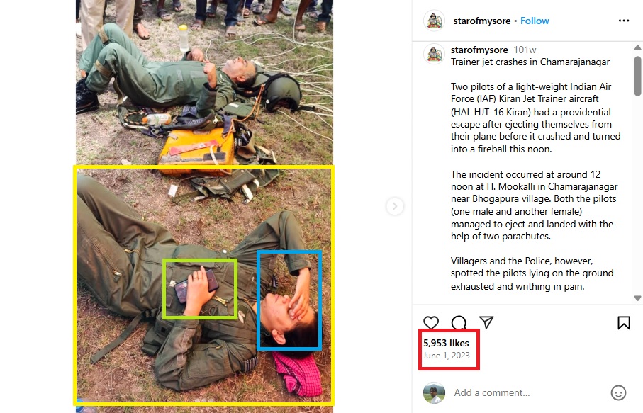 ہم نے خاتون پائلٹ کی تصویر کو سب سے پہلے گوگل ریورس امیج ٹولز کی مدد سے تلاش کیا۔ اس دوران ہمیں ایک جون 2023 کو شیئر شدہ اسٹار آف میسور نامی انسٹاگرام پر ہوبہو خاتون پائلٹ کی تصویر موصول ہوئی، البتہ اس تصویر میں ایک اور مرد پائلٹ بھی زمین پر لیٹے ہوئے نظر آرہے ہیں۔