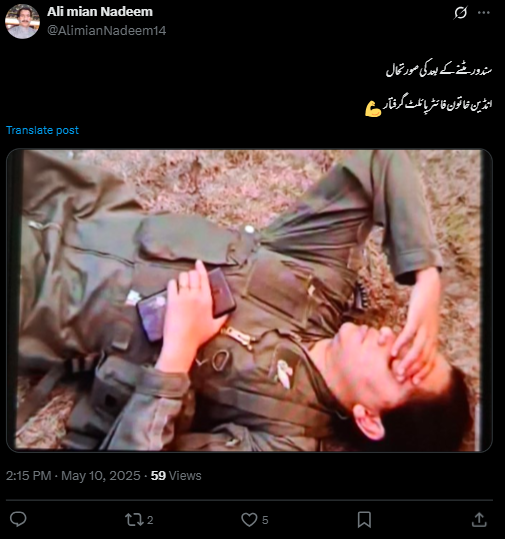 سوشل میڈیا پر خاتون پائلٹ کی ایک تصویر شیئر کی جا رہی ہے، جس میں وہ ایک ہاتھ سر پر رکھے ہوئی ہیں اور دسرے ہاتھ میں موبائل لئے ہوئے زمین پر لیٹی نظر آ رہی ہیں۔ صارفین کا دعویٰ ہے کہ حالیہ بھارت اور پاکستان تنازعہ کے درمیان پاکستان نے بھارتی خاتون پائلٹ کو سرحد سے گرفتار کیا ہے۔