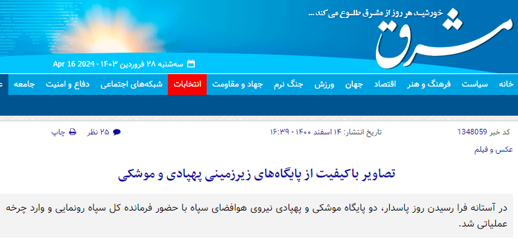 ہم نے وائرل ویڈیو کے ایک فریم کو ین ڈیکس سرچ کیا۔ تب ہمیں وائرل ویڈیو میں نظر آرہے ہوبہو مناظر کی تصاویر کے ساتھ شائع ایرانی نیوز ویب سائٹ مشرق پر ایک رپورٹ ملی ۔جس کے مطابق یہ تصاویر آئی آر جی سی ایرو اسپیس فورس کے میزائل اور ڈرون کی ہے۔ لیکن یہ رپورٹ کب کی ہے؟ یہ واضح نہیں ہو سکا۔