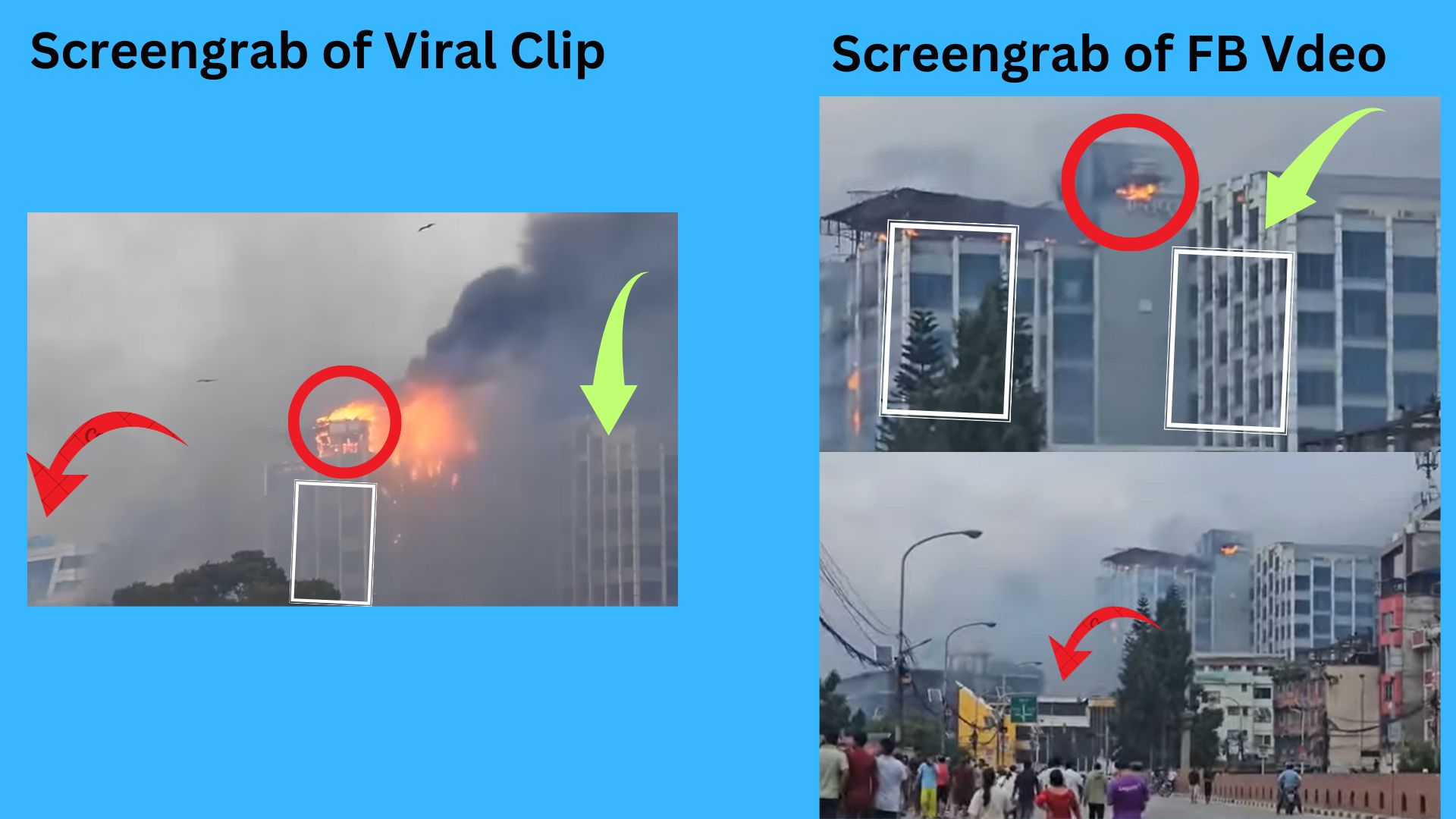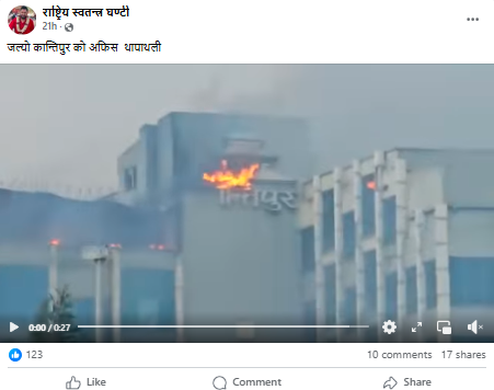 پھر ہم نے نیپالی زبان میں لکھ کر چند کیورڈ فیس بک پر تلاش کیا۔ اس دوران ہمیں اسی عمارت کی الگ اینگل سے فلمائی گئی ویڈیو فیس بک پیج راشٹریہ سوتنترگھنٹی پر موصول ہوئی۔ جس میں بھی اس ویڈیو کو نیپال کے تھاپتھلی میں موجود کانتی پور دفتر میں لگائی گئی آگ کا بتایا گیا ہے۔ اس ویڈیو کو جب ہم نے غور سے دیکھا تو اس پر کانتی پور لکھا ہوا نظر آیا۔