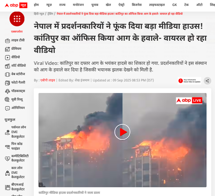 ویڈیو کی اصلیت جانچنے کے دوران ہمیں بین الاقوامی میڈیا رپورٹس بھی موصول ہوئیں۔ بھارتی خبر رساں ادارے اے بی پی نیوز نے 9 ستمبر 2025 کو اپنی رپورٹ میں یہی ویڈیو شائع کی تھی، جس کے مطابق یہ ویڈیو کٹھمنڈو کے “کانتی پور ٹی وی ہیڈکوارٹر” پر مظاہرین کی جانب سے کئے گئے شدید حملے اور عمارت کو نذرِ آتش کئے جانے کی ہے۔