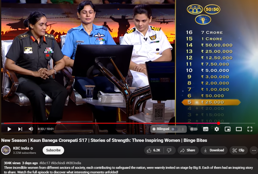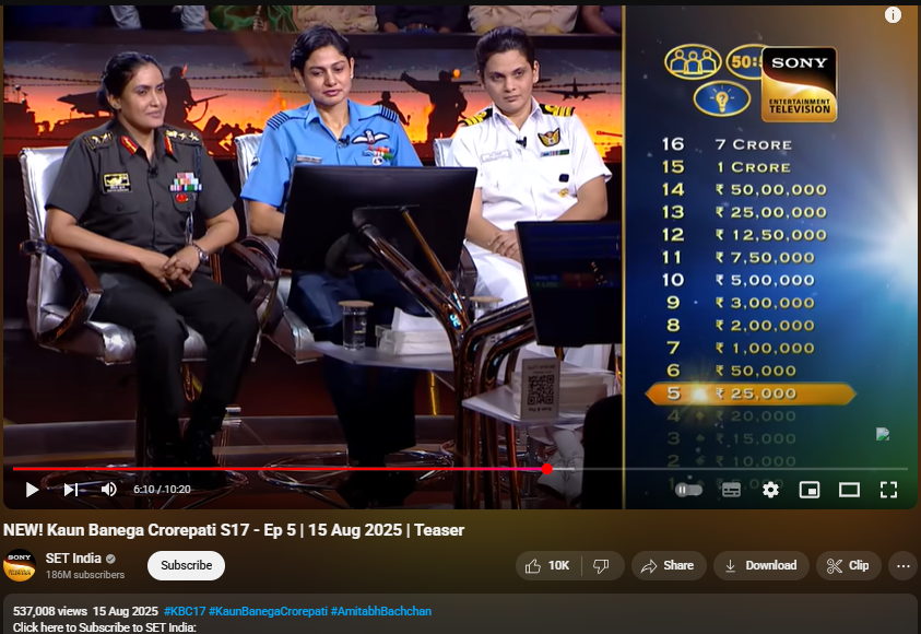 Video published by YouTube channels SET India and KBC India on 15/18 Aug 2025